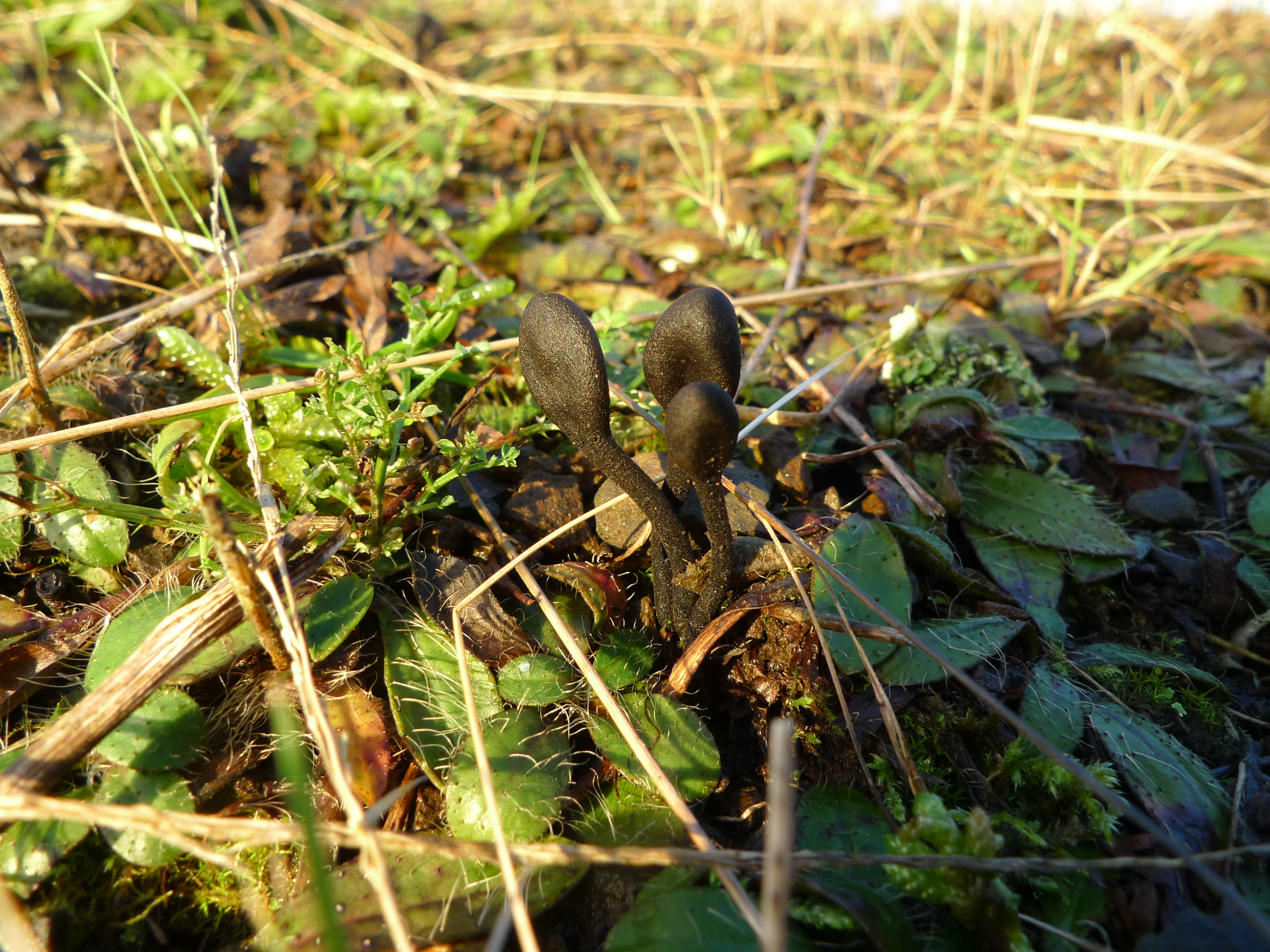 Some more interesting fungi have been spotted on the Rowley Hills recently, and their appearance this late in the year is undoubtedly due to the unseasonably mild weather we’ve been having. These are Earth Tongues, which are important indicators of nutrient-poor grasslands of high value for nature. They normally appear during October and November, and from their appearance it’s obvious where their name comes from! There are several similar-looking species and the shape of this one suggests it is a Trichoglossum; it’s not possible to make a more accurate identification without a microscope.