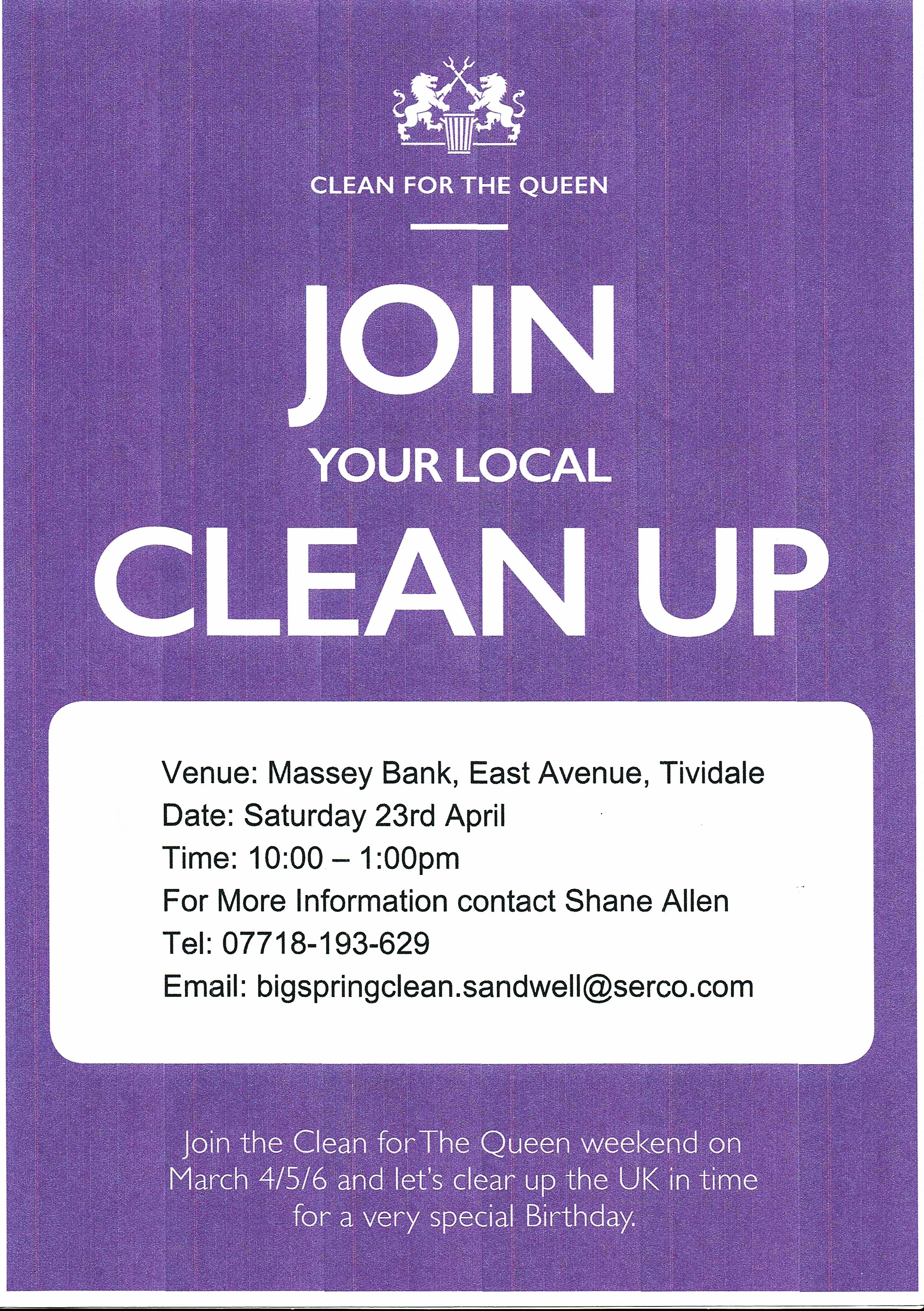 Clean for The Queen is a campaign to clear up Britain in time for Her Majesty the Queen’s 90th birthday, which will be officially celebrated in June 2016. We are holding a litter pick in partnership with Serco and Keep Britain Tidy as part of Clean for the Queen; why not join us on Saturday 23rd April, 10:00am – 1:00pm to get Massey’s Bank looking spick and span! Click here for more information about the Clean for the Queen campaign; you can also contact Shane Allen for more information about this particular event on 07718 193629 or bigspringclean.sandwell@serco.com.