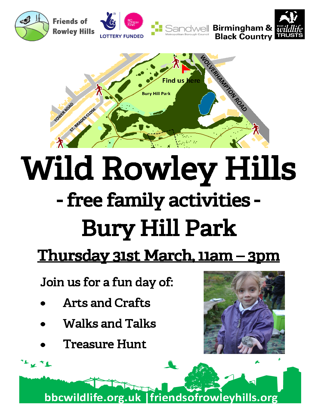 On Thursday 31st March we will be in Bury Hill Park, 11:00am – 3:00pm, with the Wildlife Trust for Birmingham & the Black Country running lots of fun, FREE, family activities including arts and crafts, walks and talks and a treasure hunt. All of these events are completely free for anyone who wants to come, thanks to our funding from the Big Lottery Fund. You don’t need to book, just turn up! Take a look at the posters below for further info and location maps: