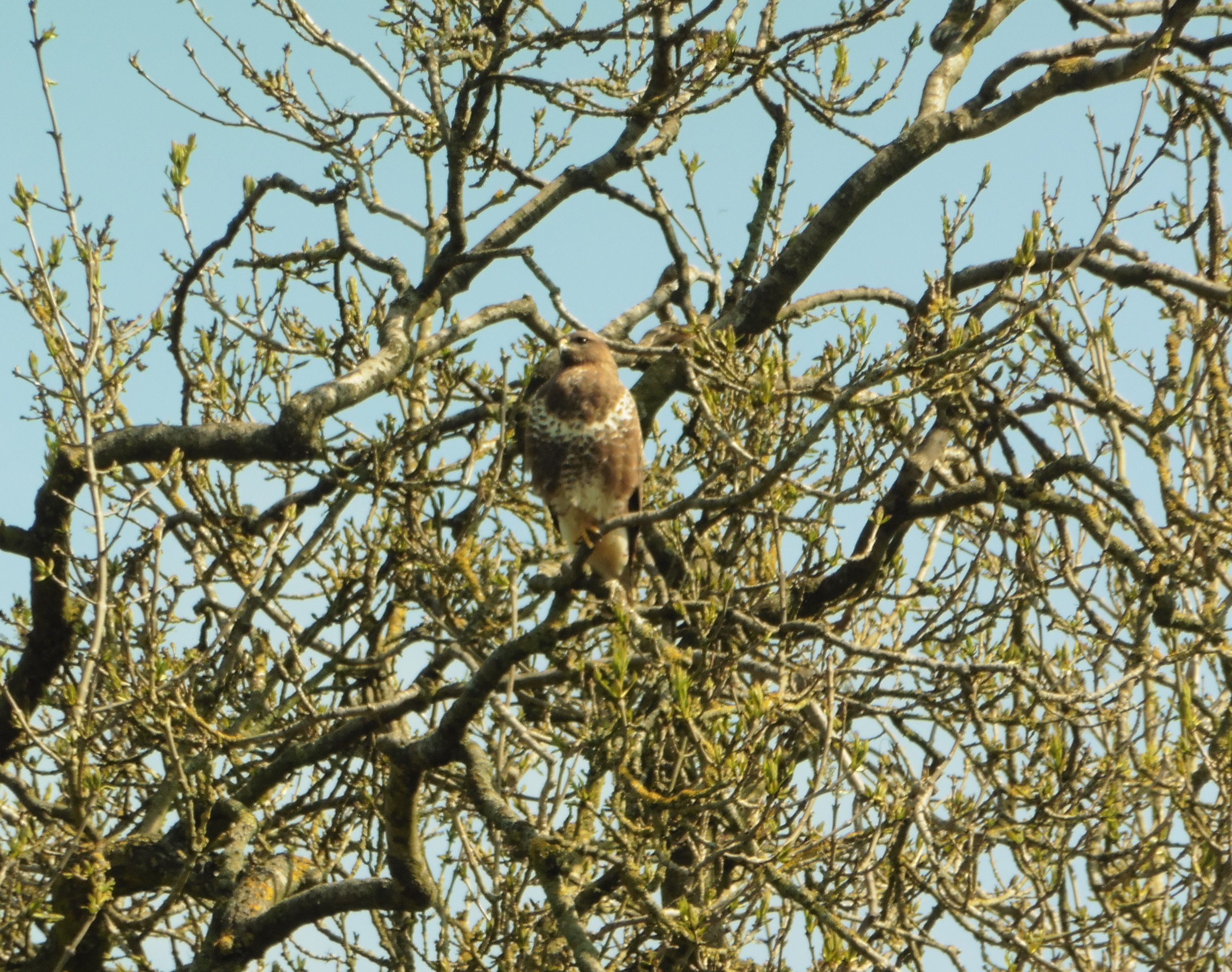 A small warbler noted in the hedgerow was confirmed by Nick as Garden Warbler after consulting his bird book to compare it with the very similar and much commoner Chiffchaff. Debatably, the most memorable sighting was probably our last of the day. There before us in a large Ash tree, whose leaves were not yet open, sat a Buzzard, totally oblivious of our presence. Through binoculars it was apparent just how large this bird is and how fortunate we are to have them here on the Rowley Hills in such good numbers. Our thanks once again go to Nick for leading us and for passing on his invaluable knowledge of the bird life of this area and we look forward to him leading another bird walk for us towards the end of the summer.