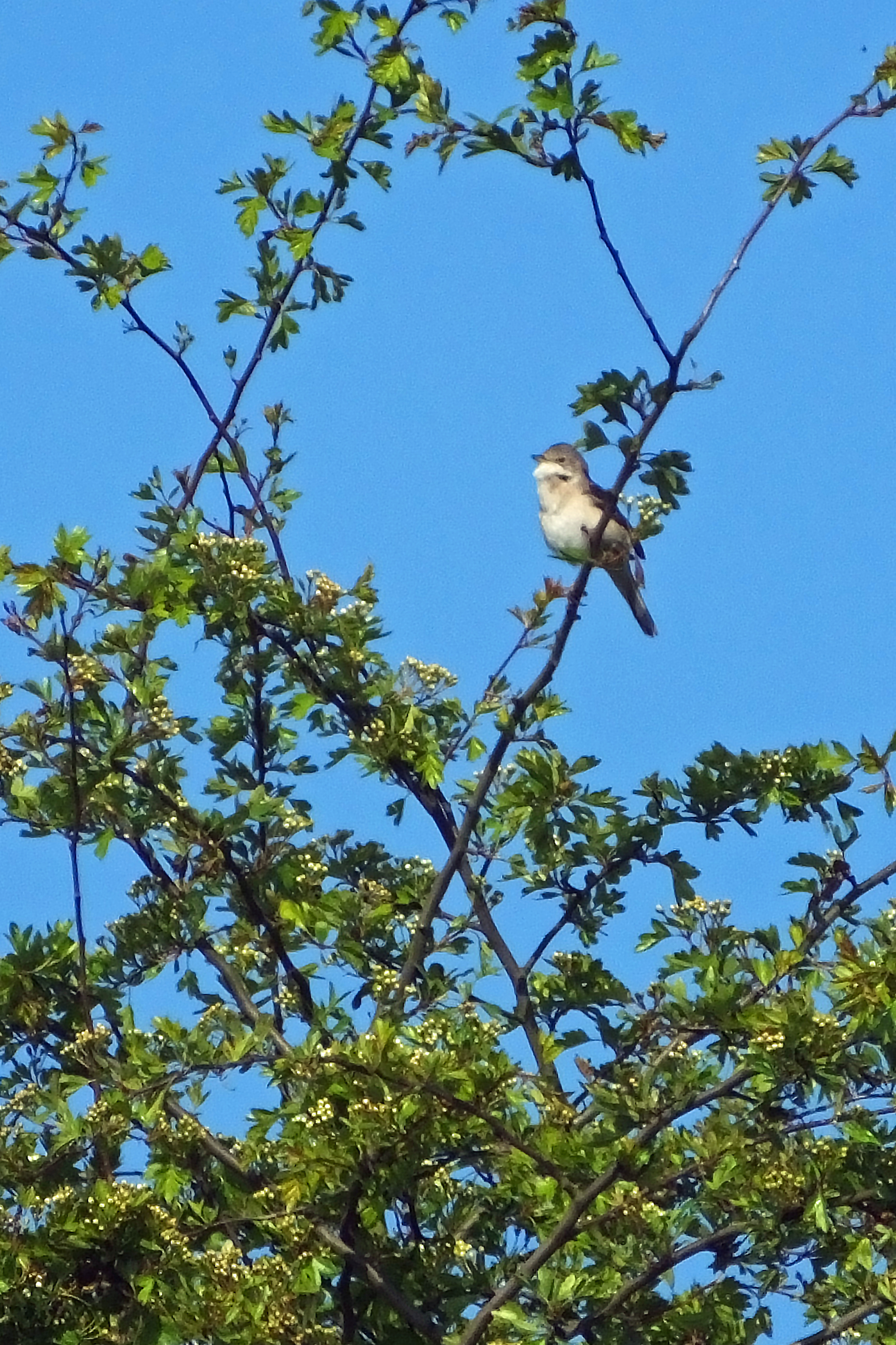 After taking in the panoramic views towards Cannock, Barr Beacon and Birmingham city centre from the top of Bury Hill Park we set off in the direction of the masts on Turners Hill pausing briefly to count 13 Swifts soaring overhead. Stopping near the extensive patches of bramble and other rank vegetation about halfway up the hillside Nick pointed out where he had previously seen Lesser Whitethroat, and as if by order, one was spotted flying low over the bramble into a nearby hawthorn bush. With similar habitat requirements to Whitethroat the Lesser Whitethroat is much less common and more secretive and can be difficult to spot.