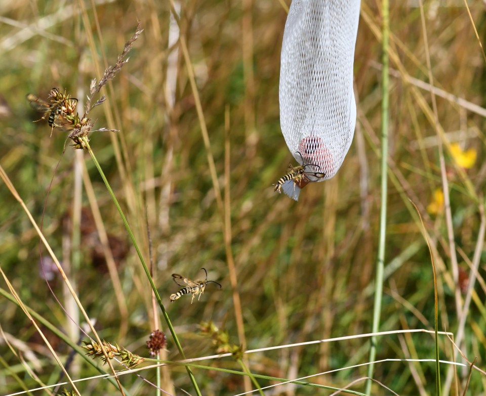 Six-belted Clearwing (Bembecia ichneumoniformis) moths attracted to pheromone (image © Andy Purcell) ← Previous Next → Six-belted Clearwing (Bembecia ichneumoniformis) moths attracted to pheromone (image © Andy Purcell)