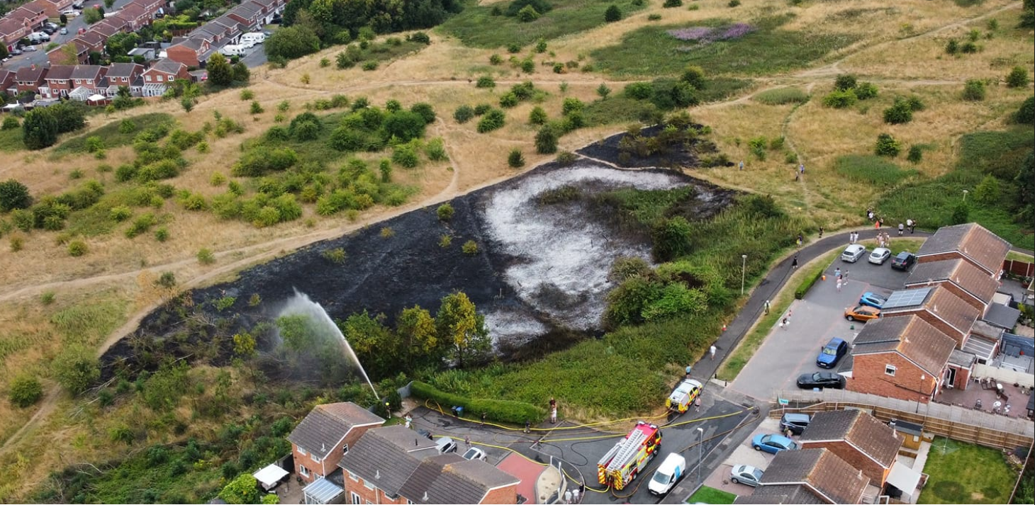 As has been widely reported during the recent heatwaves, there has been a big increase in wildfires around the country, and unfortunately this has included the Rowley Hills. Last month, a large area of felled trees on Portway Hill at the end of St Brades Close caught fire. These trees had been left by contractors who felled them in 2021, and despite the risk (not to mention the right of way that had become blocked by the trees) had not returned to remove them. The contractors were acting on behalf of the owner of that parcel of land.