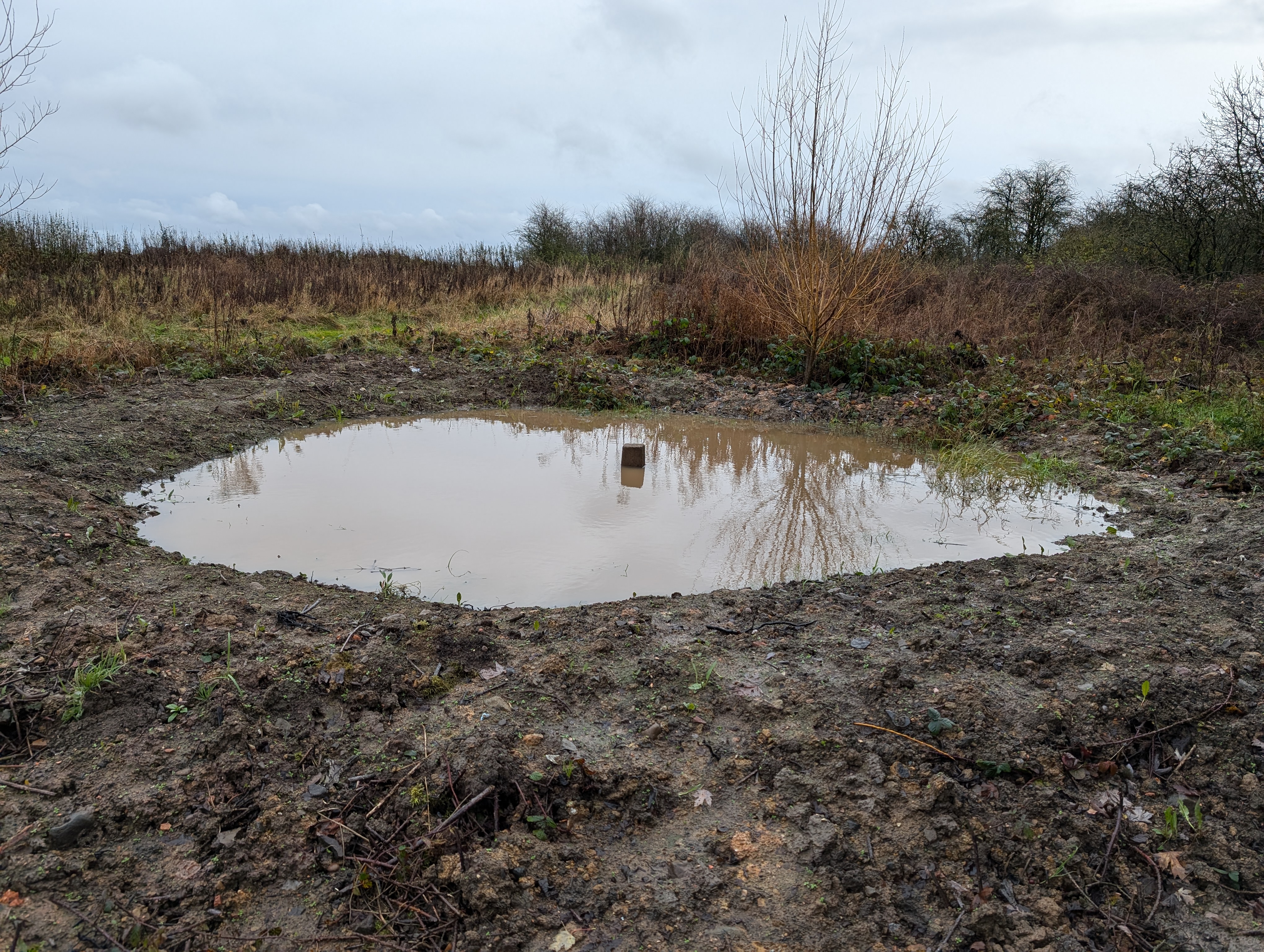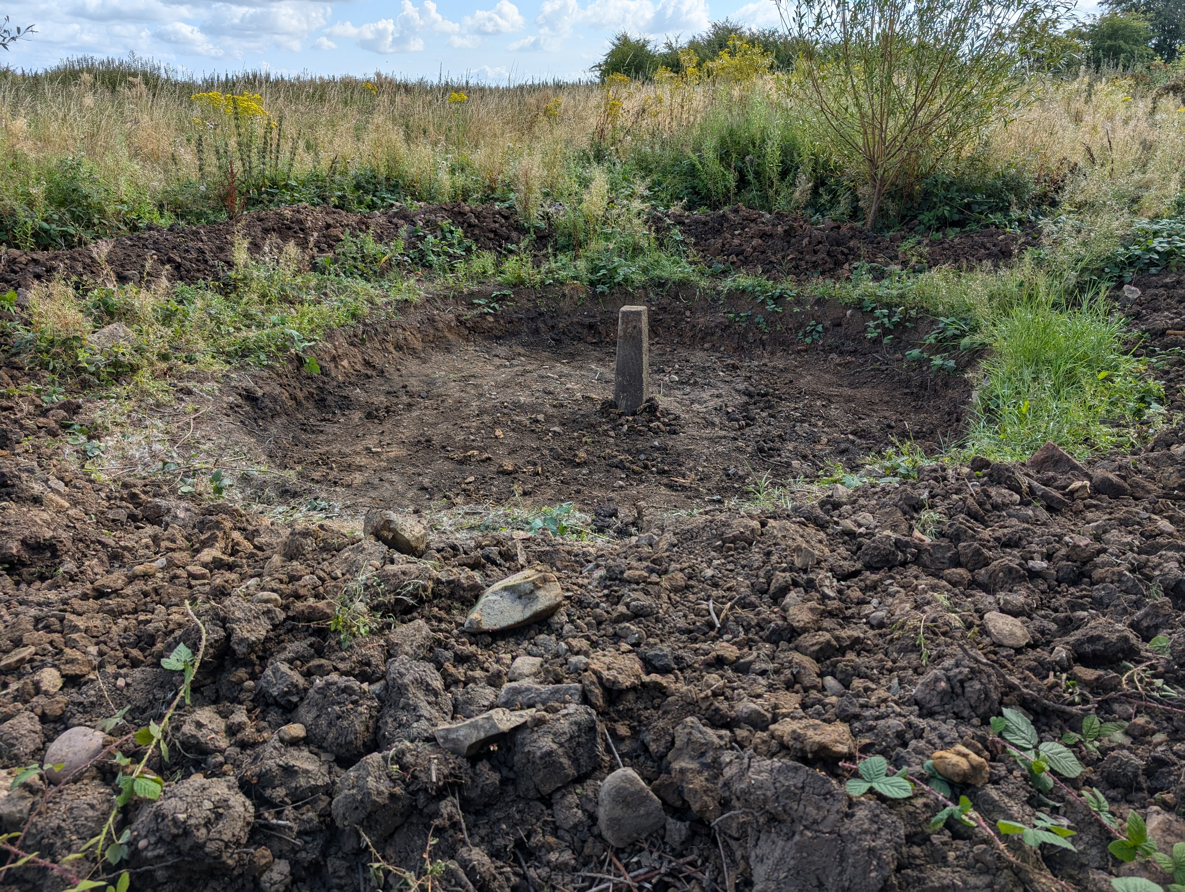 drain slowly, so by treading down the bottom and sides, known as ‘puddling’ the pond was made as watertight as possible. Although the pond is likely to dry out during the summer it is hoped that some water will remain long enough for tadpoles of any amphibians that might be present to metamorphosise. A concrete post, uncovered while digging, was placed upright in the middle of the pond to provide a perching post for birds and to give us an idea of the depth of the water at any given time. Within no more than a week from completion, and after heavy rain, the water level in the pond slowly started to rise, and by late summer the water-level had almost risen to the top of