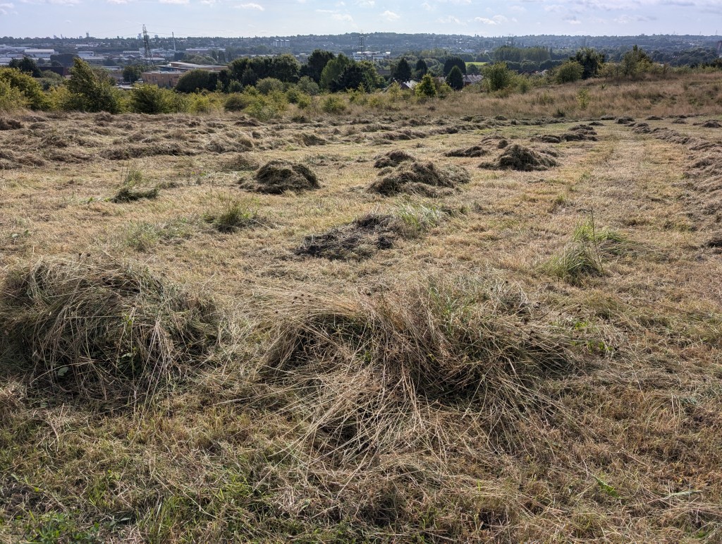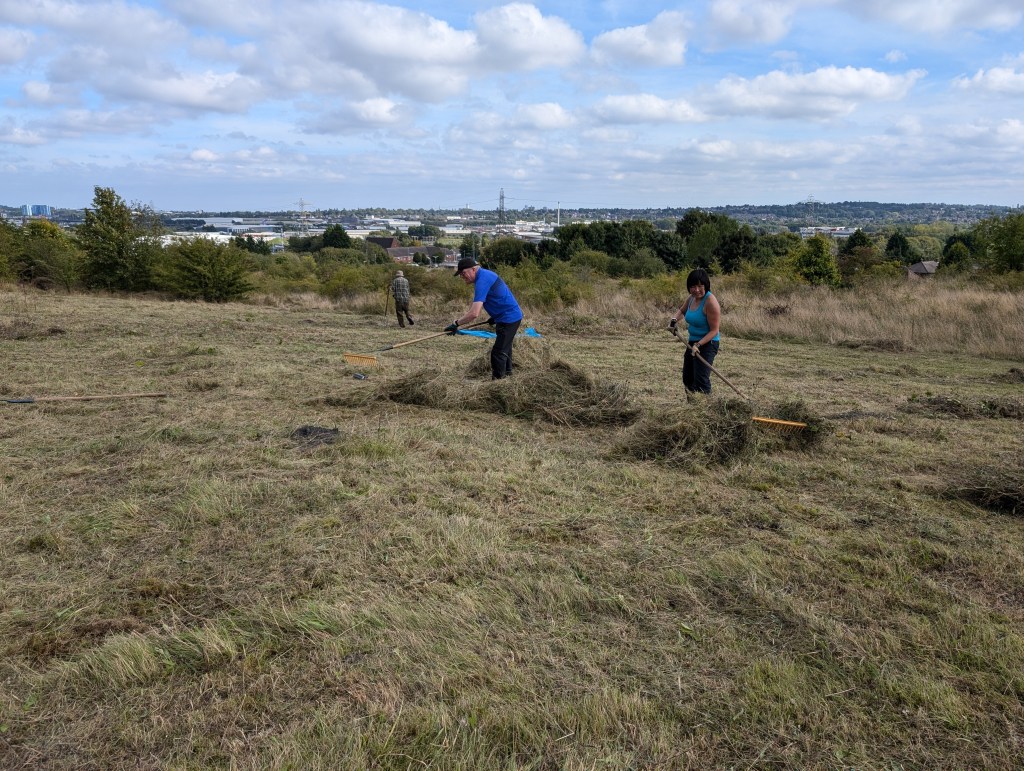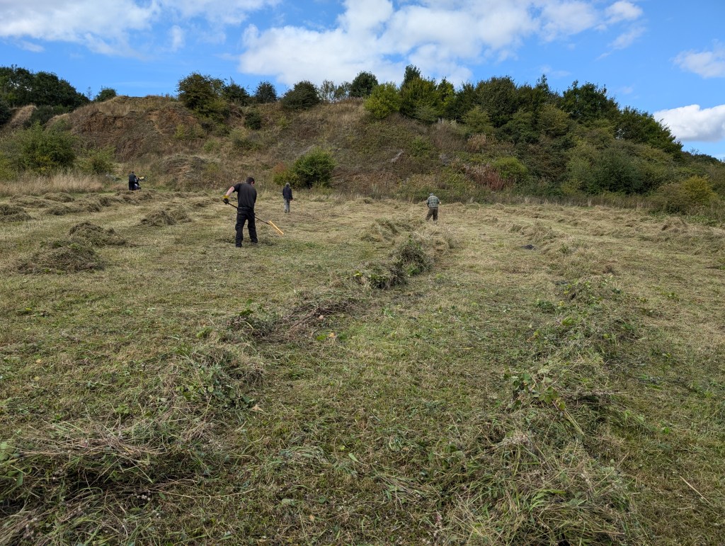 To maintain a species-rich wildflower meadow involves cutting and removing the arisings on an annual basis at an appropriate time of the year. The Wildlife Trust meadow is now a well-established wildflower meadow and by the early part of September when flowering and seeding was at an end, the meadow was ready for its annual cut. Volunteers set to work, and the resulting hay was raked into piles and then moved off the site. Reducing fertility is a key part of managing a wildflower meadow, as the poorer the soil the better it is for native wildflowers and grasses. During the raking and piling up process any seeds present will fall to the ground. Over time pernicious