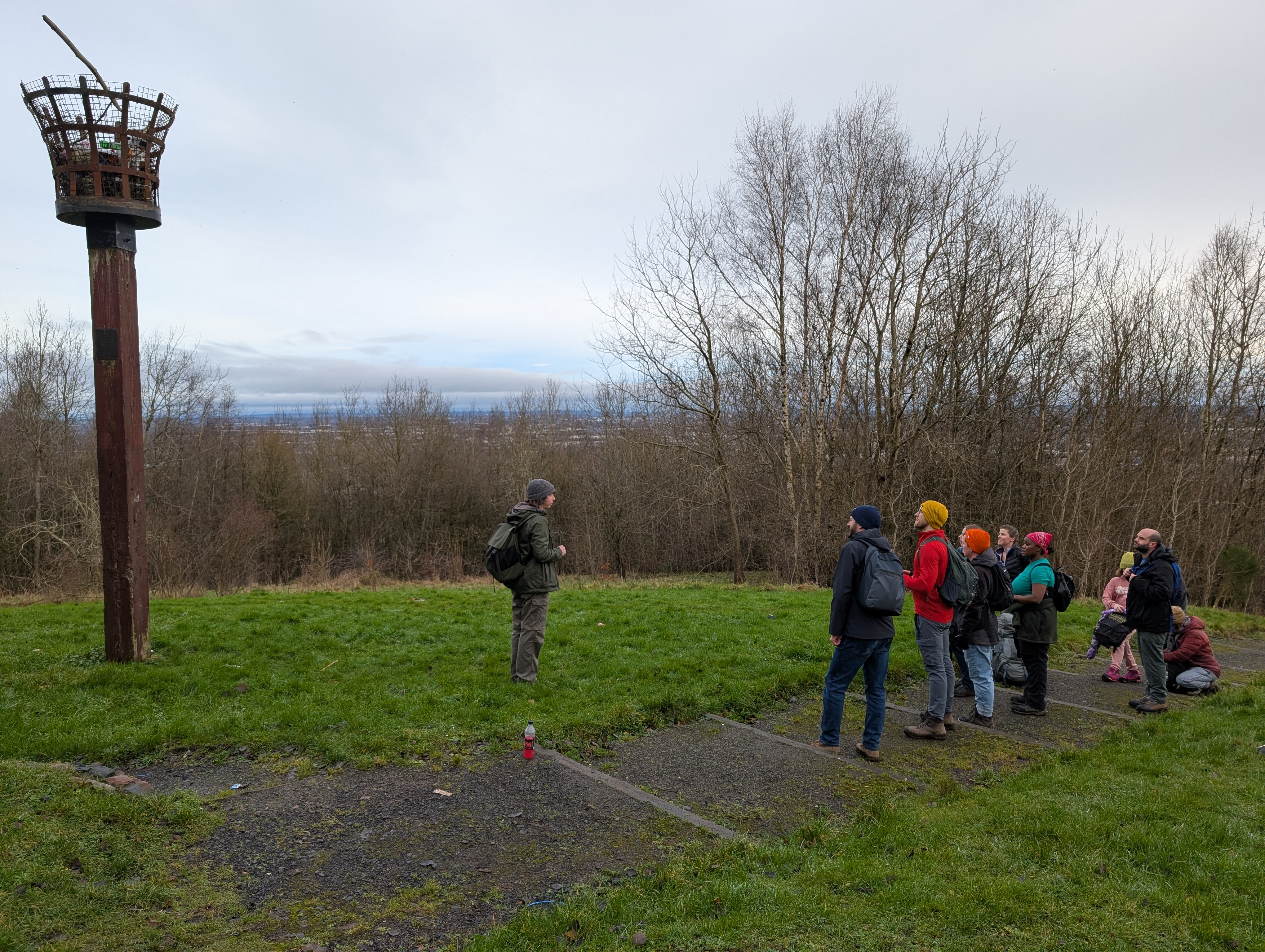 On 15th December, as part of the Dudley Path’s for Nature project, an EventBright walk entitled ‘The Peaks and Dales of Dudley’ took place, partly on the Rowley Hills starting from Bury Hill Park, and eventually ending in the centre of Dudley. After introductions by our two joint leaders Andy and Daniella, the group first took in the view towards Birmingham and beyond from the summit of the park, and then headed downhill through Bob’s Canyon to the cairn on the Wildlife Trust’s land, where Andy talked about Dudley born mountaineer Bert Bissel’s accomplishments and the peace cairn on the summit of Ben Nevis, the highest mountain in the UK. The next stopping place was the